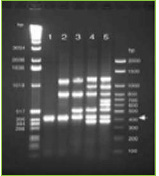 FGF is made possible by our unique fixed-random (FR) primers. FR primers specifically amplify only the exons in the genome, avoiding the remaining 99% of the genome that is non-functional. This example shows that incorporating more randomized segments in the primer set amplifies more exons from the human genome (Lane 1 through Lane 5). In FGF, the same subset of exons from the diseased and normal genomes are compared and the differences in length can be used to identify the defective exons and genes from the diseased genome.